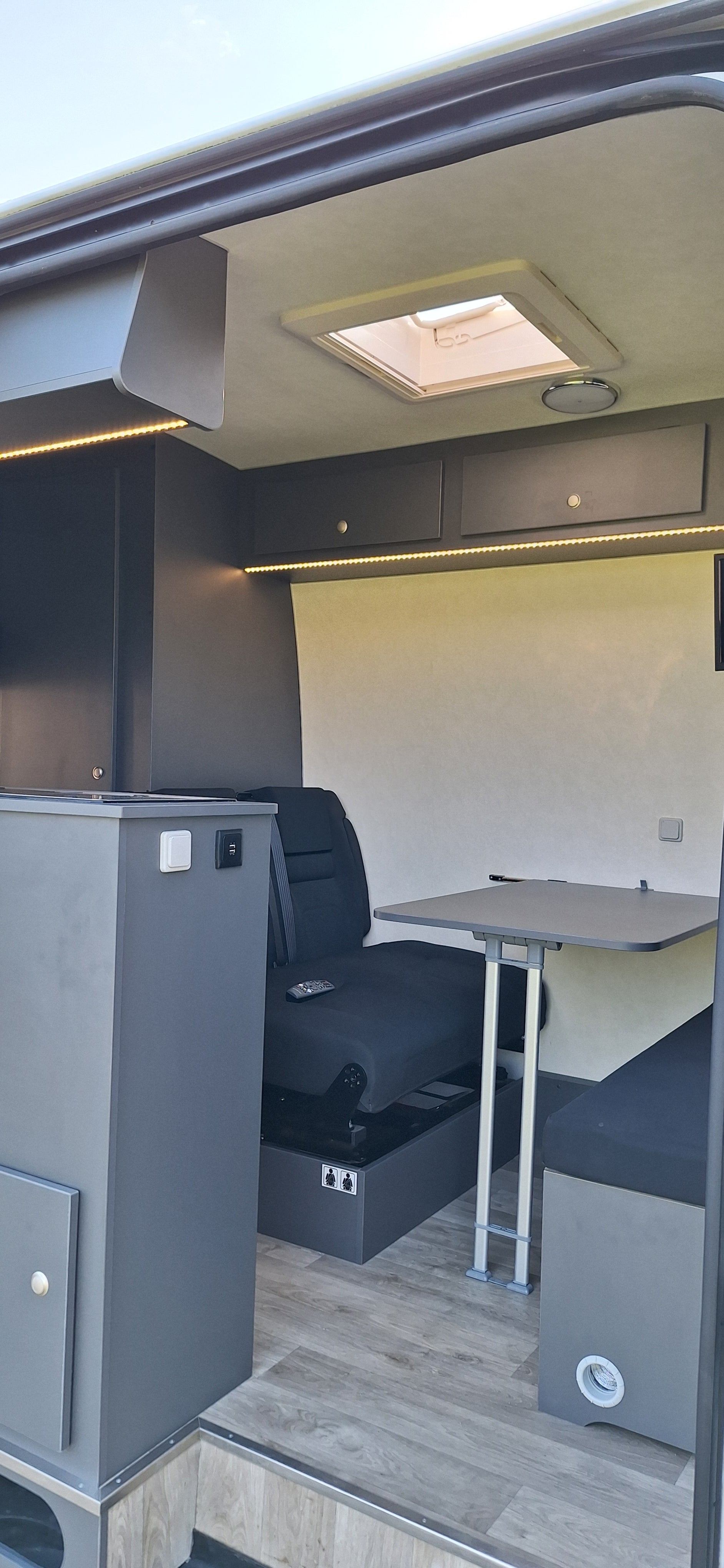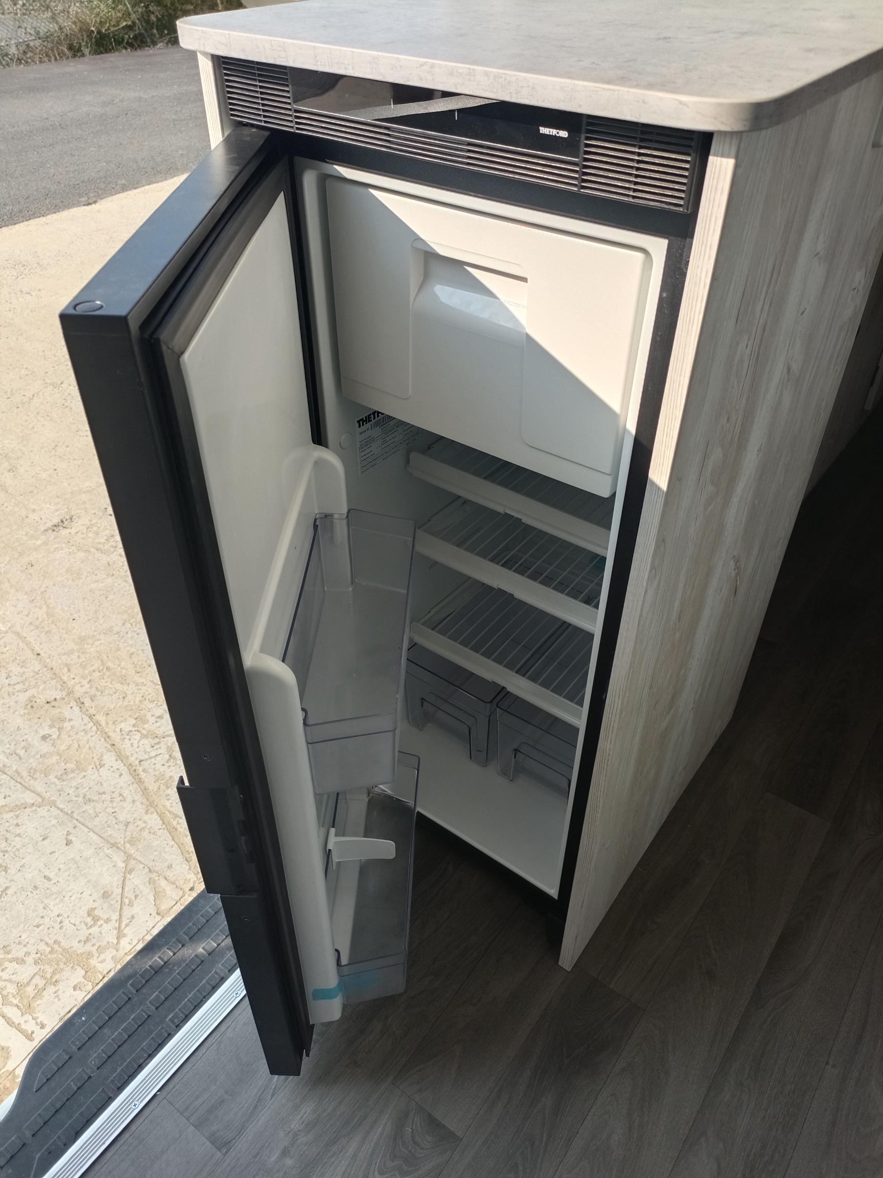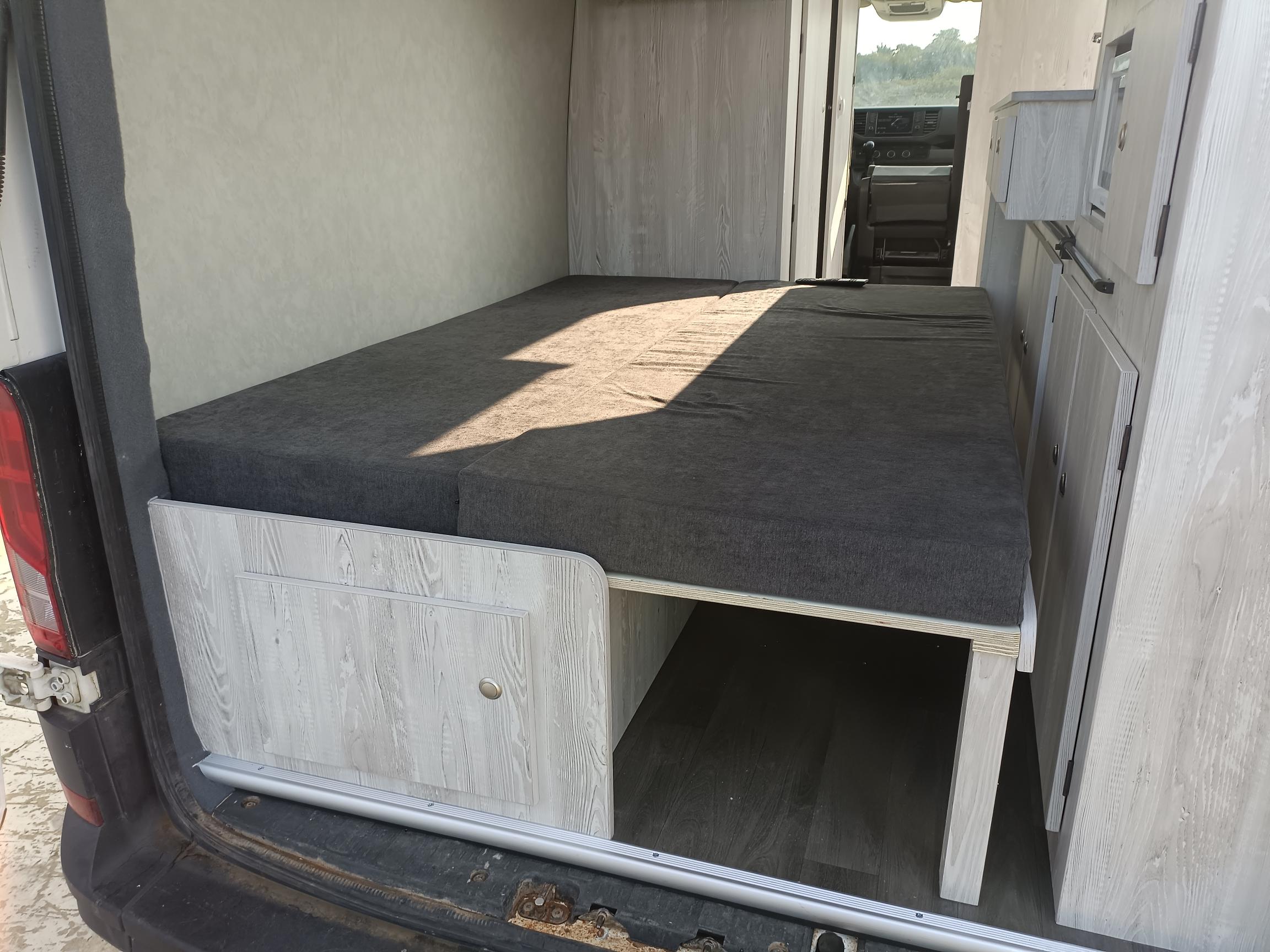 FORD TRANSIT L3H3, 2 places assies, lit permanent à l'arrière, soute sous le lit, meuble cuisine avec réfrigérateur à compression, cabinet de toilette, panneau solaire, réservoir eau propre 100L, réservoir eaux usées 80L