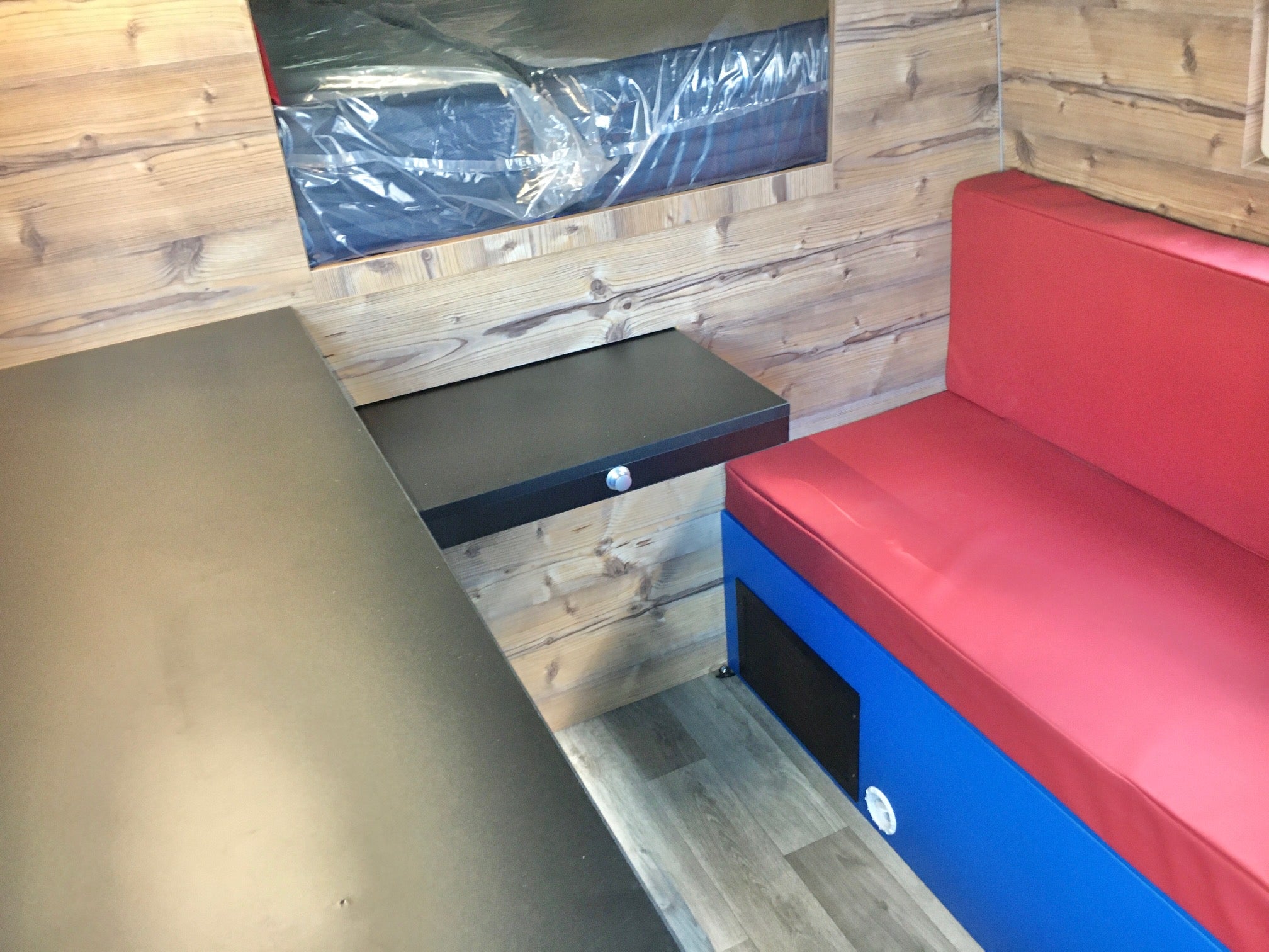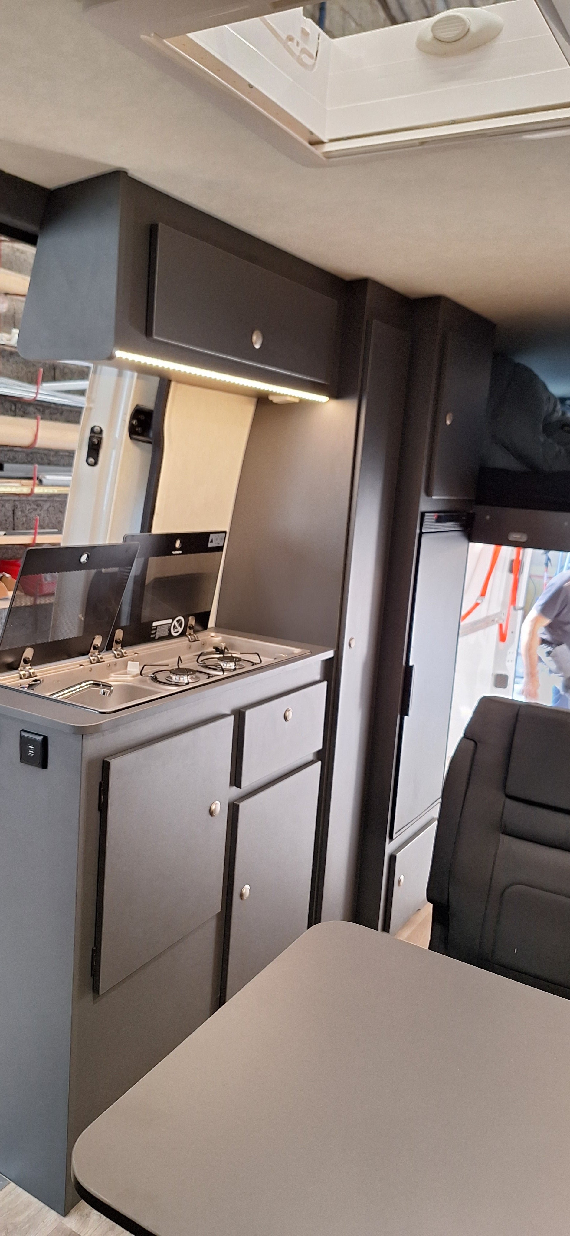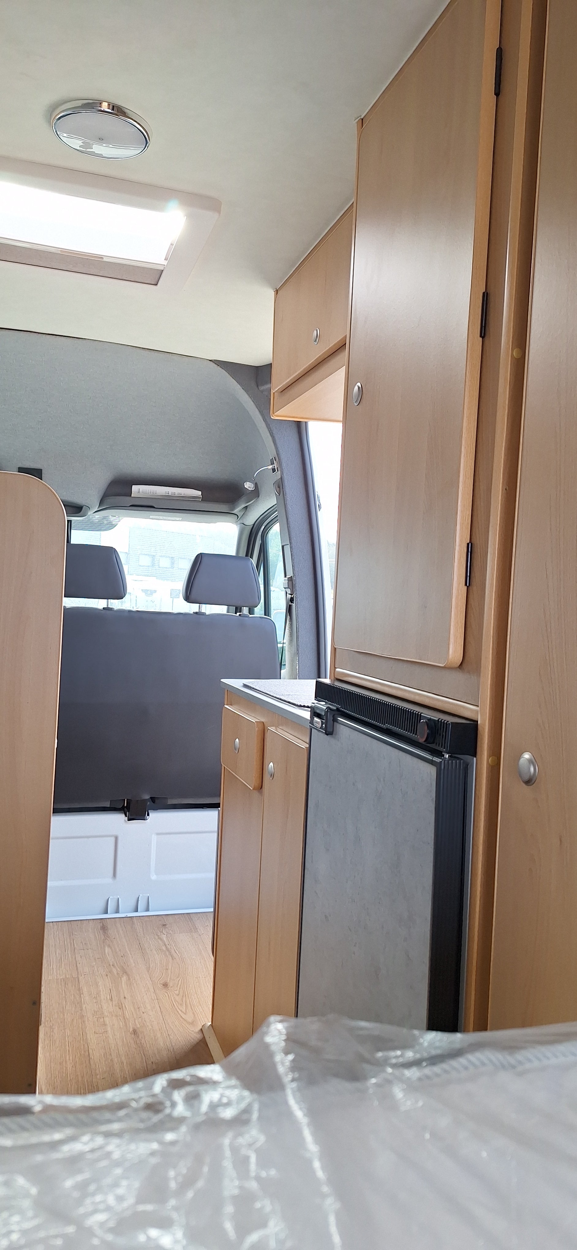 FORD TRANSIT L3H3, 2 places assies, lit permanent à l'arrière, soute sous le lit, meuble cuisine avec réfrigérateur à compression, cabinet de toilette, panneau solaire, réservoir eau propre 100L, réservoir eaux usées 80L