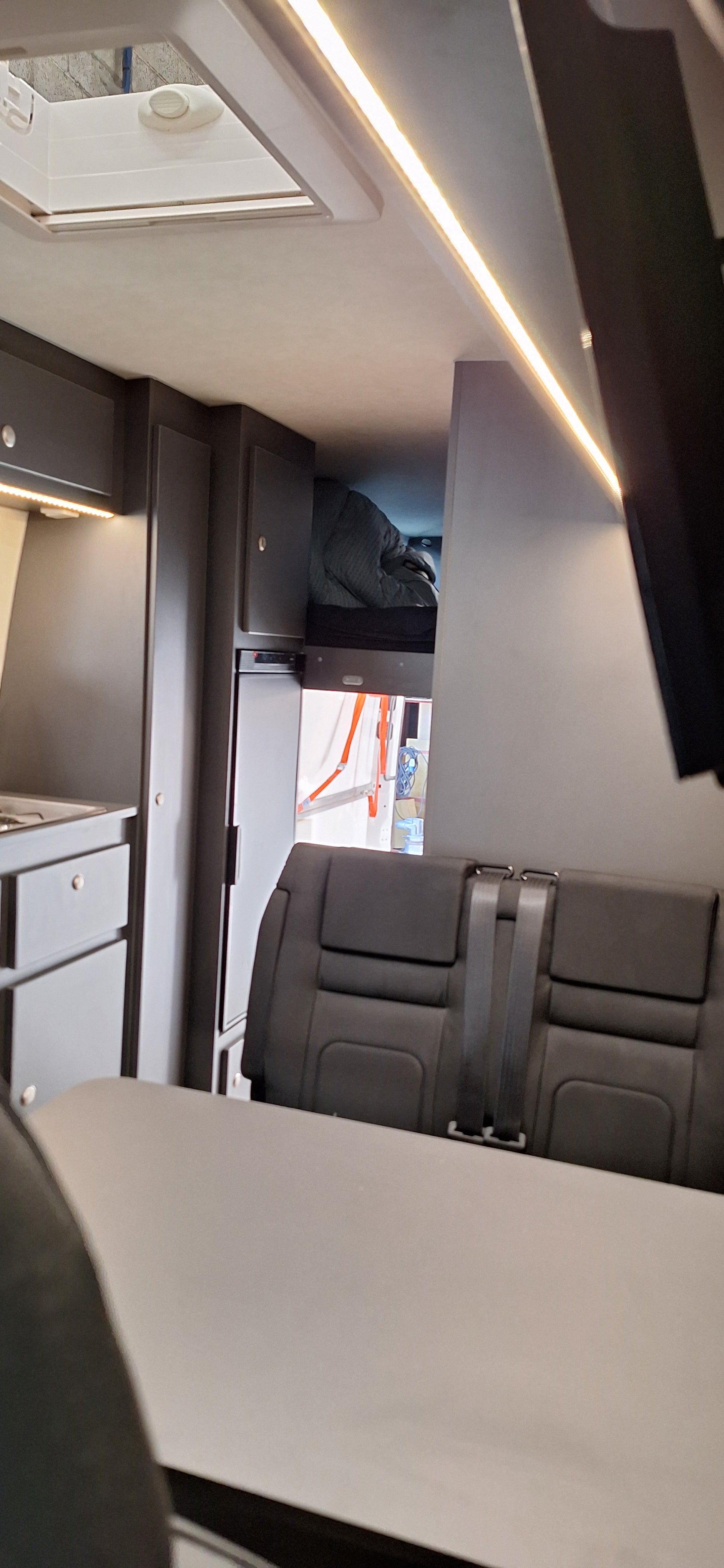 MERCEDES SPRINTER 5 places assises, 4 couchages, 1 lit permanent, 1 caisson d'assise servant de complément pour une couchette double, coin cuisine, réfrigérateur à compression 90L, un réchaud 2 feux à gaz avec couvercle, un évier avec couvercle