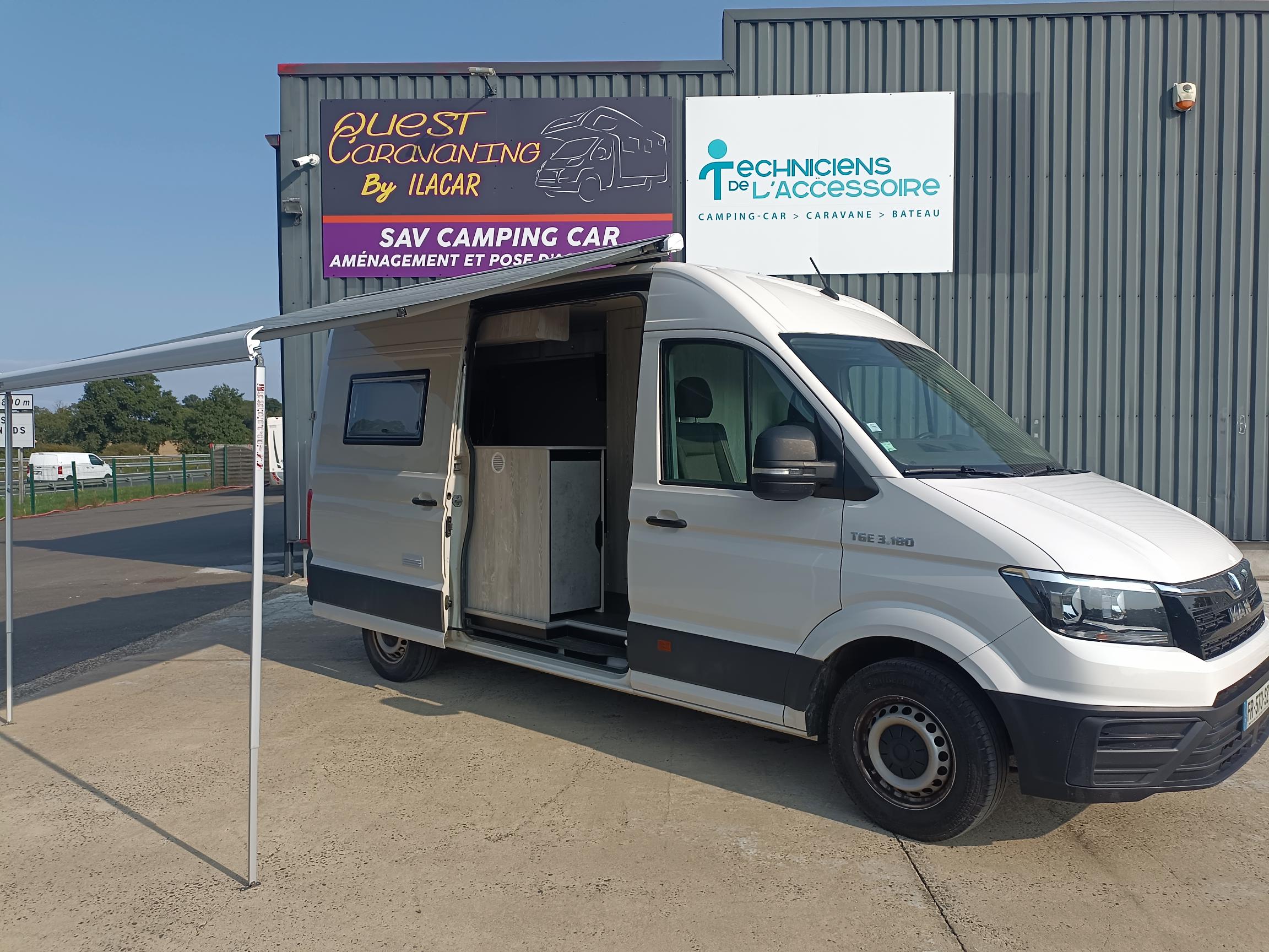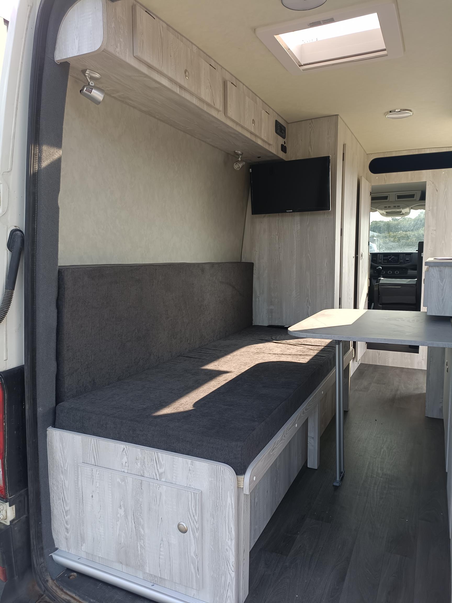 WV CRAFTER 3 places assises, couchage 2 places, compartiment salle de bain, lavabo et mitigeur, wc portable, coin cuisine réfrigérateur, réchaud, table amovible
