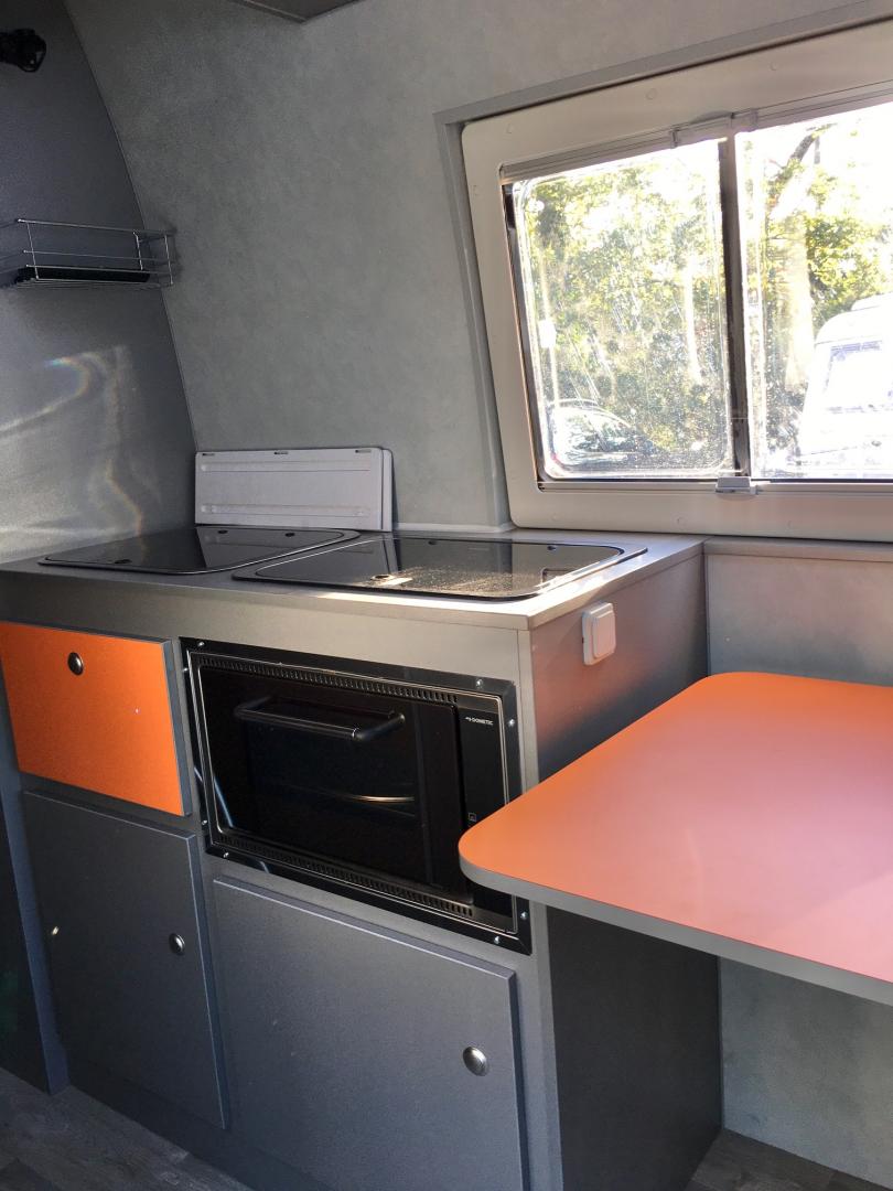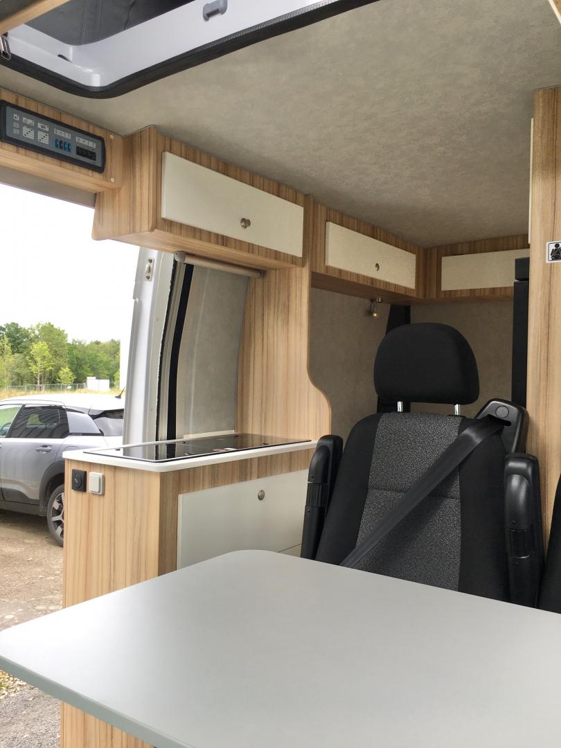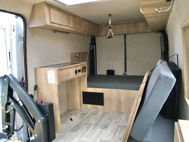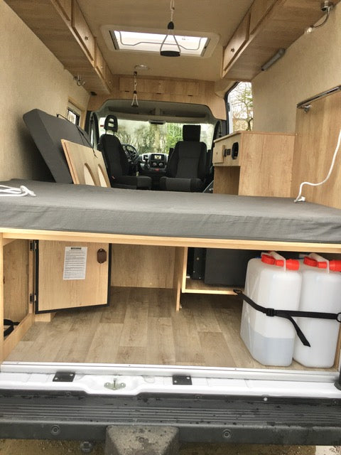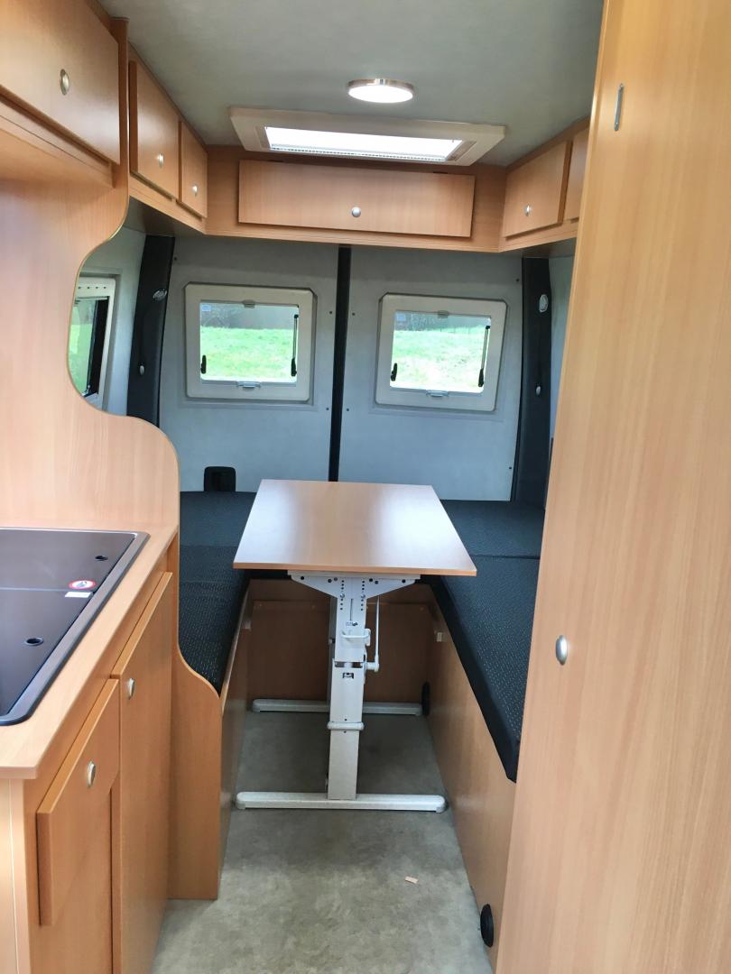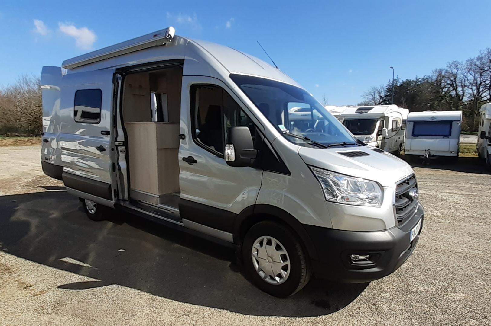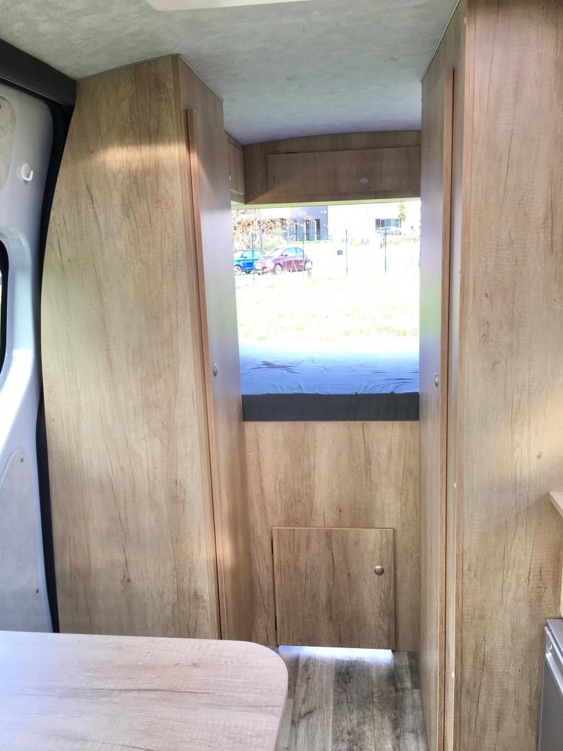 FORD TRANSIT L3H3, 2 places assies, lit permanent à l'arrière, soute sous le lit, meuble cuisine avec réfrigérateur à compression, cabinet de toilette, panneau solaire, réservoir eau propre 100L, réservoir eaux usées 80L