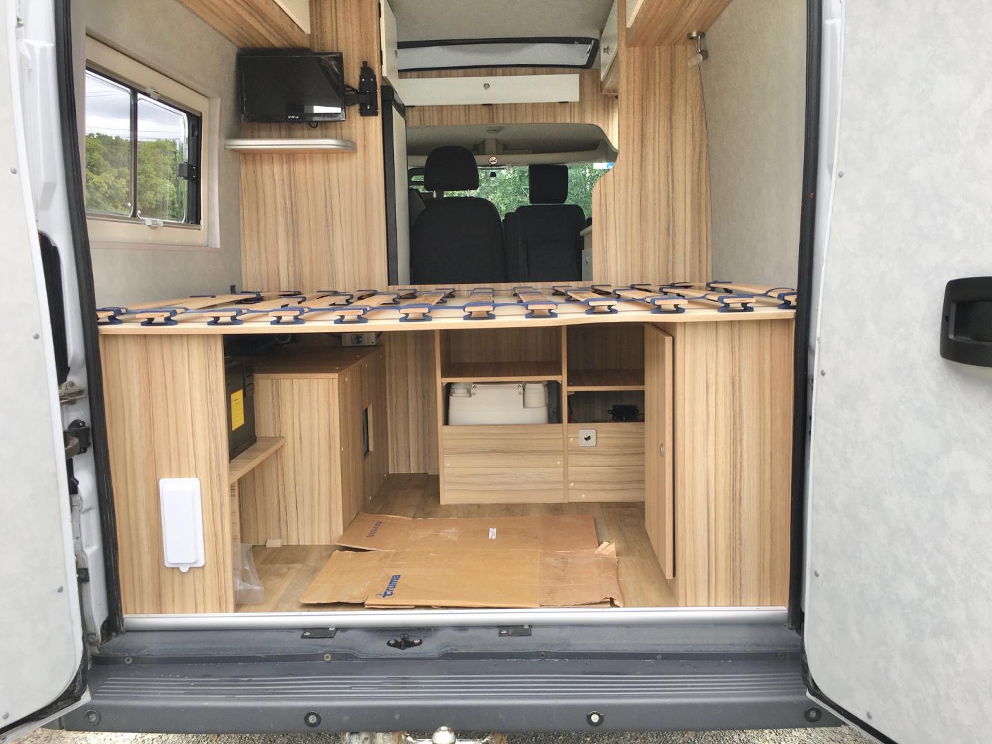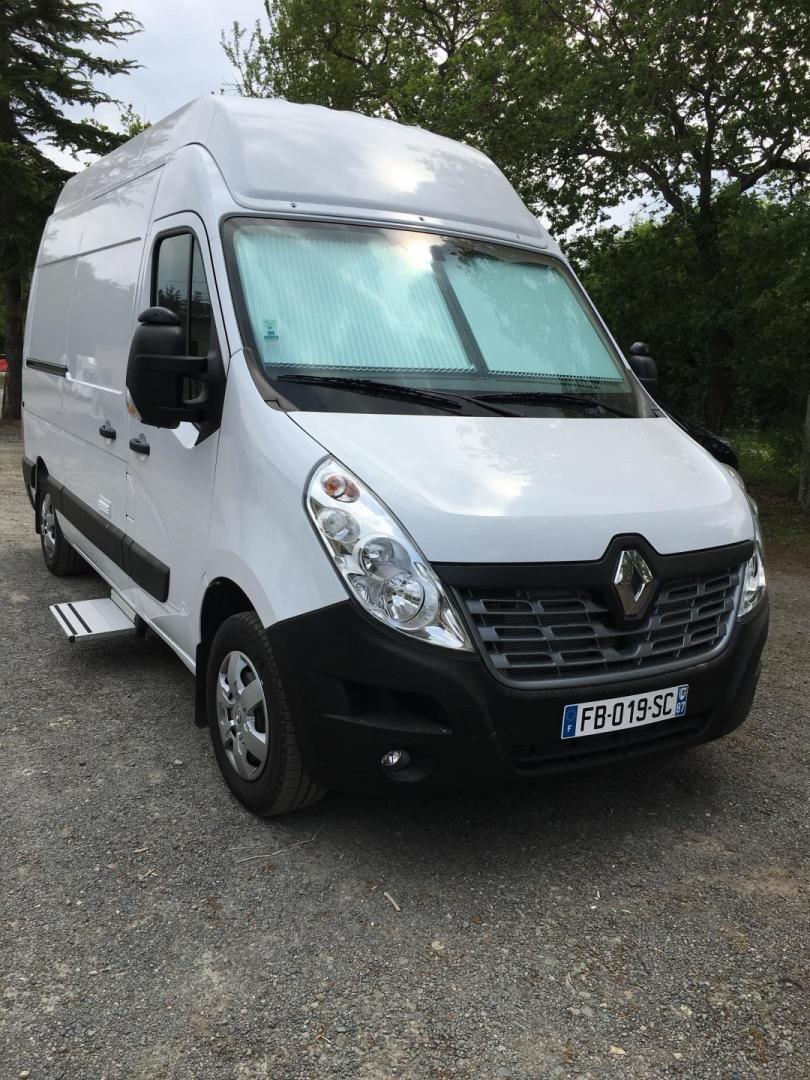Renault Master L2H3, 2 places, 1 couchette double extensible, grande soute sous faux plancher, grand cabinet de toilette arrière, frigo à compression 80L, chauffage gazole, eau chaude, 2 batteries auxiliaires, rideaux occultants du poste de conduite
